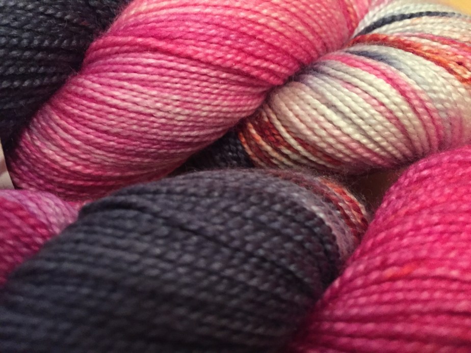 I had promised myself a drop spindle to play with when I went to Fibre East at the end of July.  However, I made a bit of a boo boo.  This year we have been a bit restricted re when we could get away as a family and after much nagging we finally agreed a week we could both do and a location and we booked it quickly as the date was only two weeks away.  After we had booked I realised it clashed with the long planned trip to Fibre East with two friends.  I have to confess to being more than a little bit gutted at this point.  I love that show and this year there were dyers I really wanted to meet, and whose yarns I was keen to see close up.  I had set aside a little budget for a yarn splurge.  And so it was I found myself on Etsy in the car on the drive to Cornwall, picking some very pretty yarns to compensate myself.  One purchase was waiting for me when I got back home. The beauties pictured below are by All Wool That Ends Wool – she dyed for my first show and the intensity of colour she achieves in her yarn is very impressive.  Anyway, I love these colourways and even though I have enough sock yarn to last me a couple of years (!) I succumbed.  I’m not even sorry.  I mean, just look at them.  The fact that they barely fit in my box of sock yarn is not something I am going to dwell on….